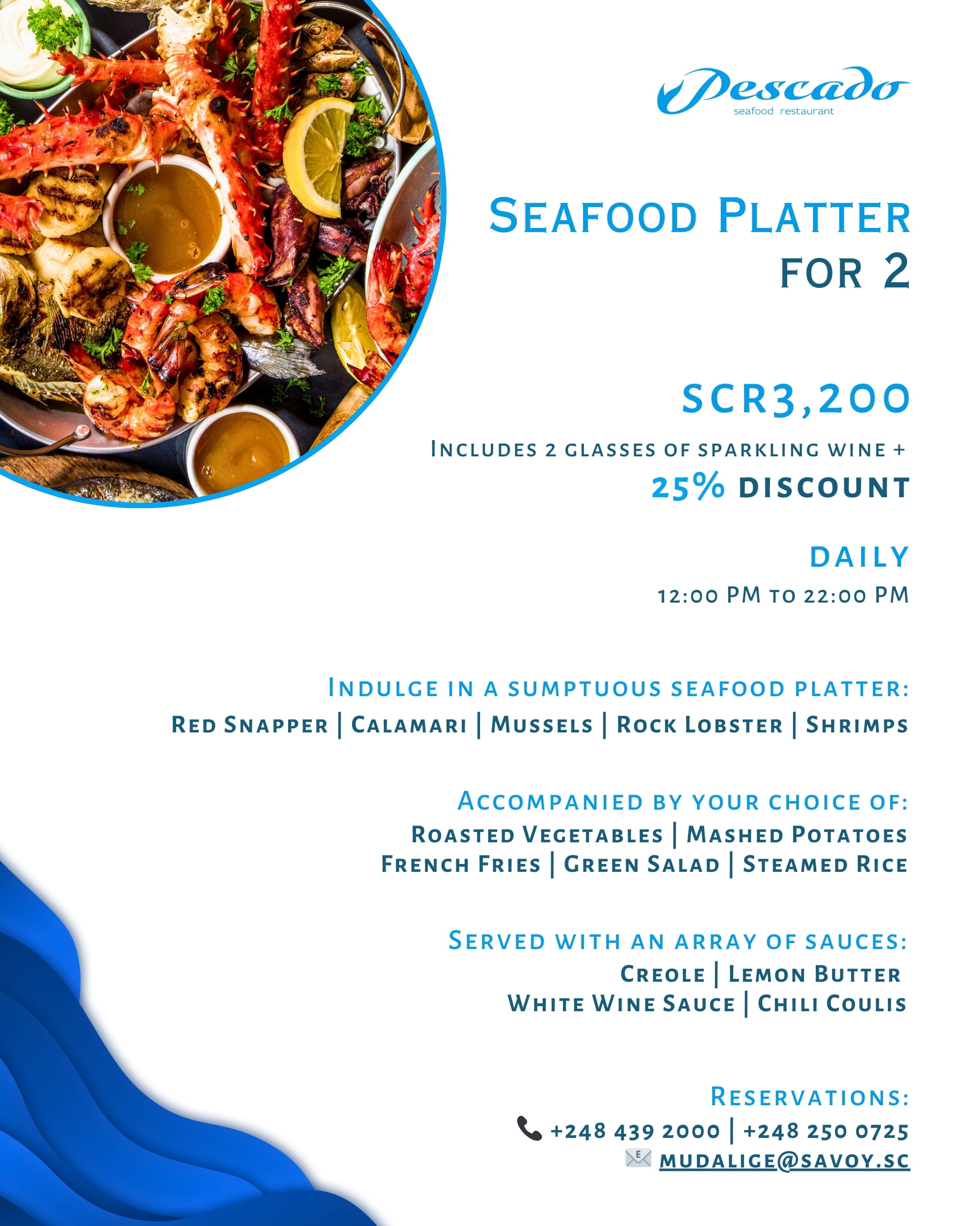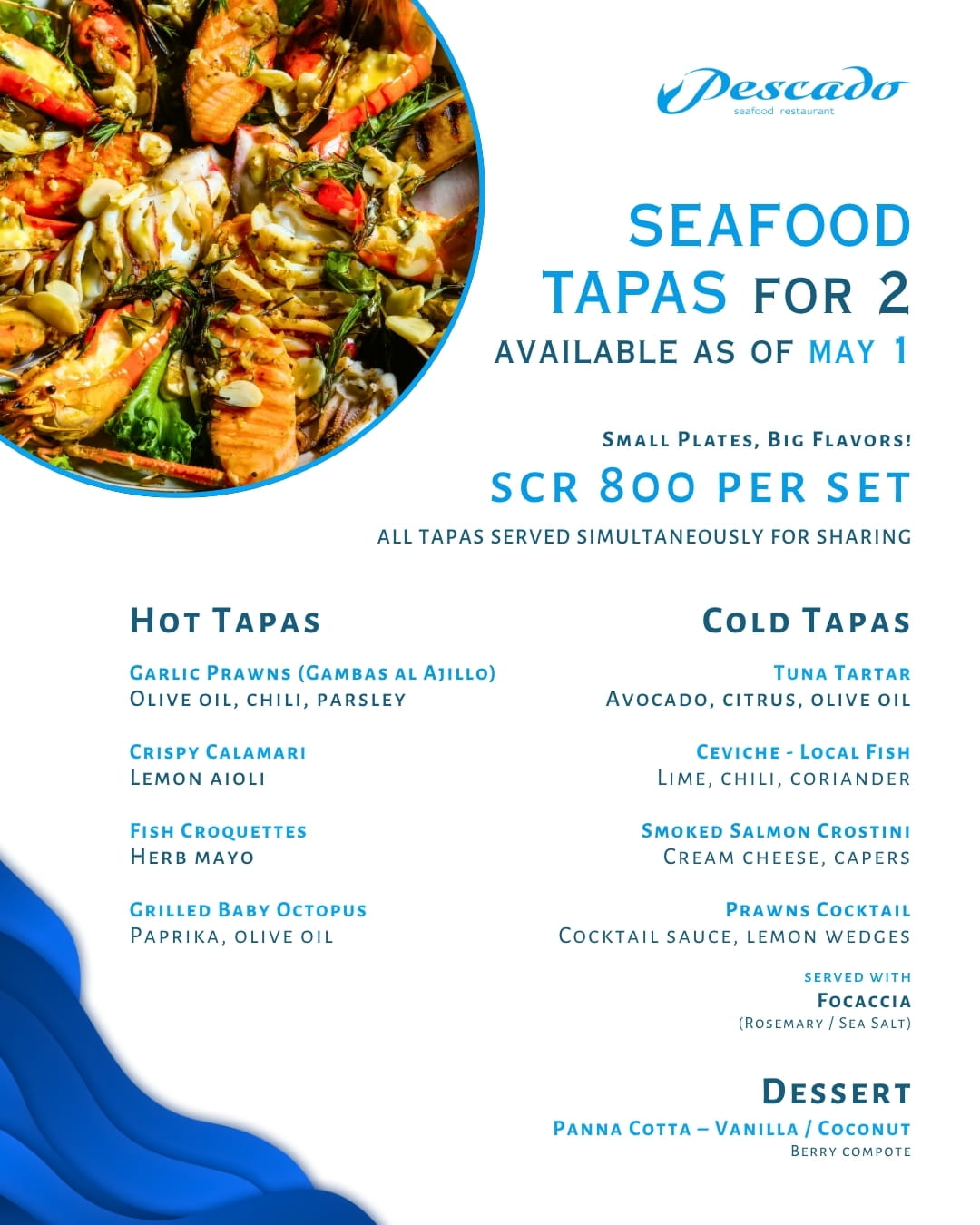 Découvrez nos offres mensuelles F&B au Pescado, où chaque mois nous mettons en avant un plat signature conçu pour offrir une expérience culinaire unique au restaurant Pescado Seafood Restaurant, Savoy Seychelles Resort & Spa.Pour le mois de mai, à partir du 1er mai, nous vous présentons notre plat vedette : les Tapas de fruits de mer Pescado.