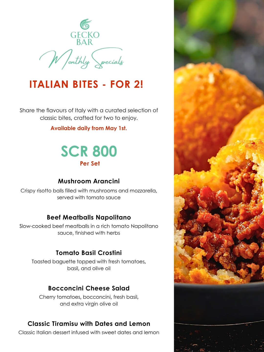 Découvrez une expérience culinaire décontractée d’inspiration italienne au Gecko Bar, Savoy Seychelles Resort & Spa.Notre expérience Sharing Italian Bites réunit une sélection soigneusement élaborée de saveurs classiques à partager à deux. Des arancini croustillants aux champignons et des boulettes de bœuf Napolitano mijotées lentement aux crostini tomate-basilic frais et à la salade de fromage bocconcini, chaque plat est conçu pour être partagé et savouré.