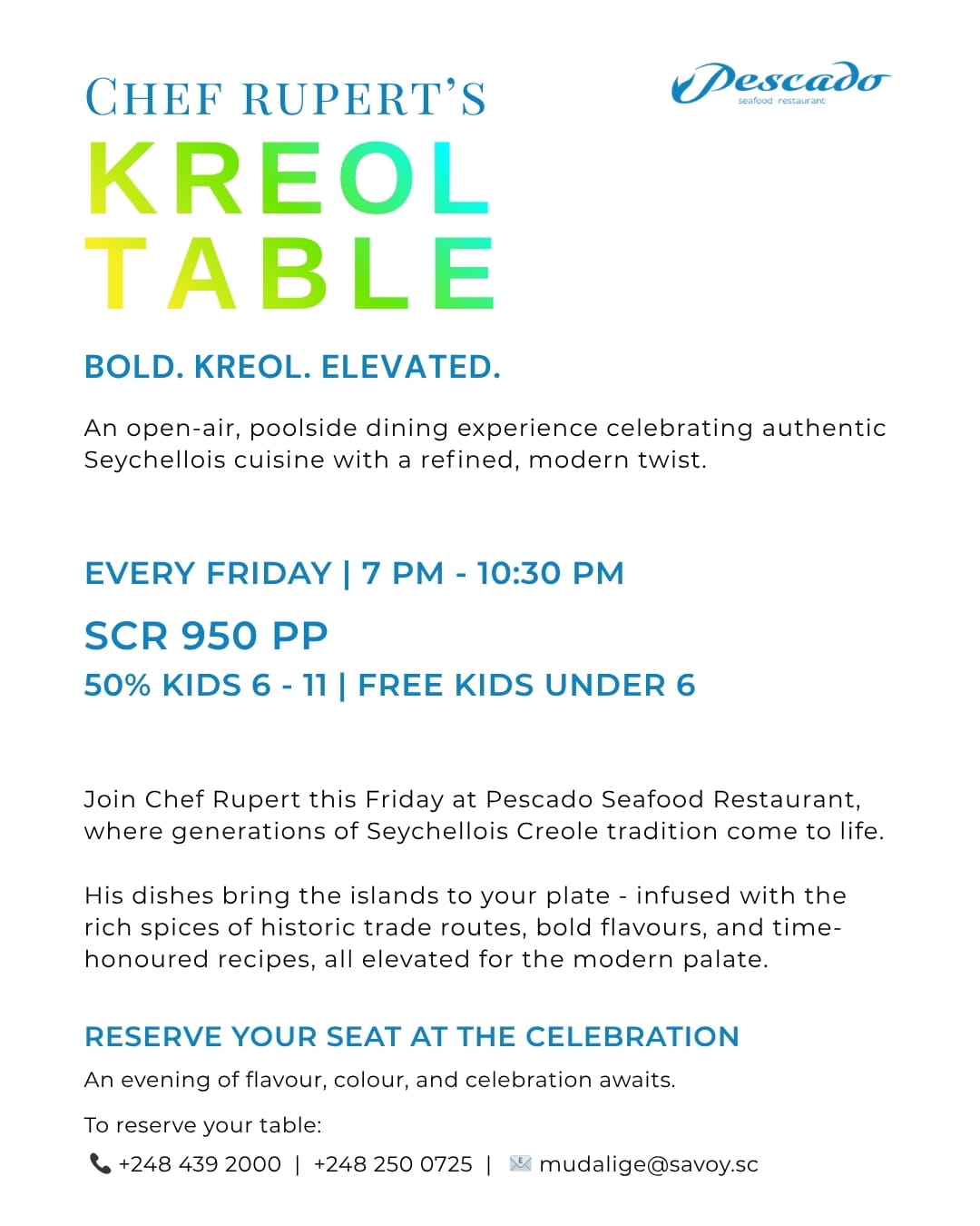 Vivez une célébration vibrante de la cuisine seychelloise avec la Table Créole du Chef Rupert au Pescado Seafood Restaurant, Savoy Seychelles Resort & Spa.Organisée chaque vendredi, cette expérience culinaire en plein air au bord de la piscine réunit des générations de tradition culinaire créole avec une approche moderne et raffinée. Les convives peuvent savourer une grande variété de plats, des viandes grillées au barbecue aux fruits de mer fraîchement préparés, le tout sublimé par des épices insulaires audacieuses et des marinades inspirées des anciennes routes commerciales.