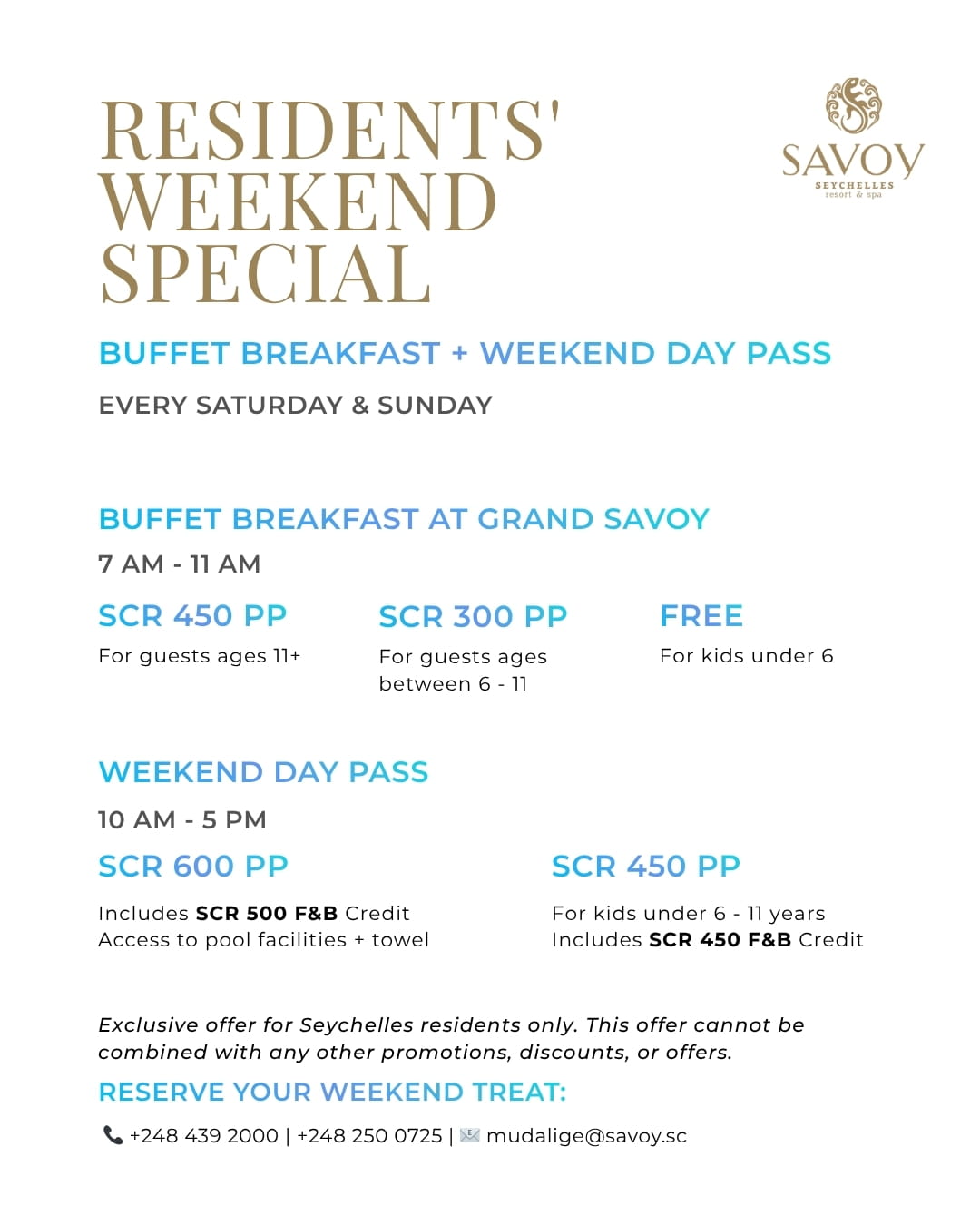 - Предложение действительно при бронировании на сайте www.savoy.sc и по электронной почте: reservation@savoy.sc